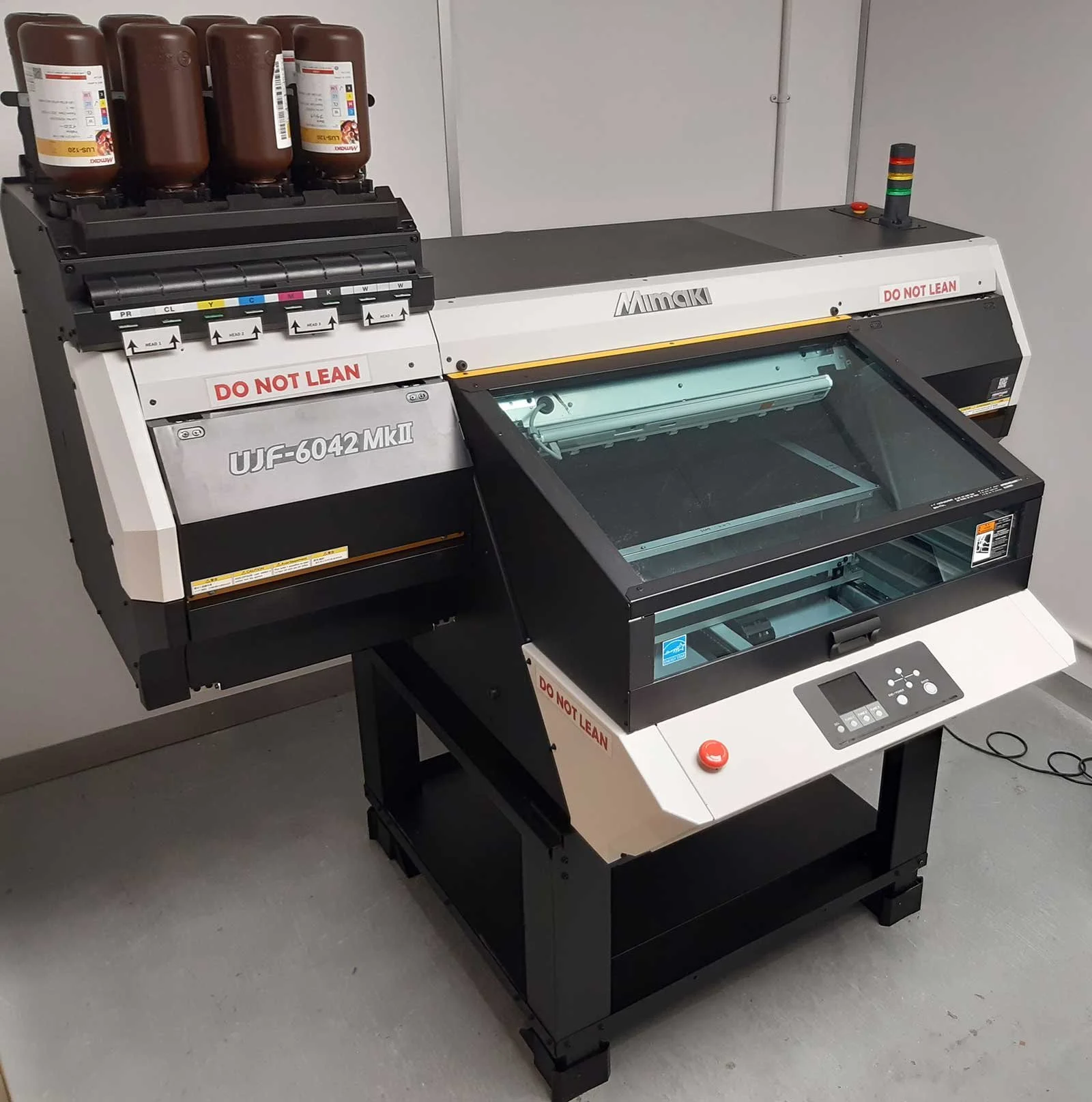 The Mimaki uses CMYK, White, Primer, and Clear UV-curable inks to print on any material that fits in the printer.