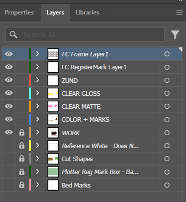 This allows the user to change the properties of each layers in RasterLink from CMYK to the varnishes.